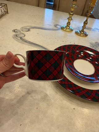Vtg Arita Tartan plaid porcelain set of 12 pieces. Dinner plate, tea cup, and saucer (set of 12, 4 of each). Made in Japan. In box