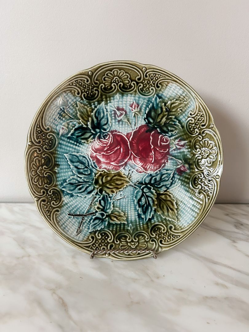 10" Wasmuel Majolica Plate w/ Pink Rose Design