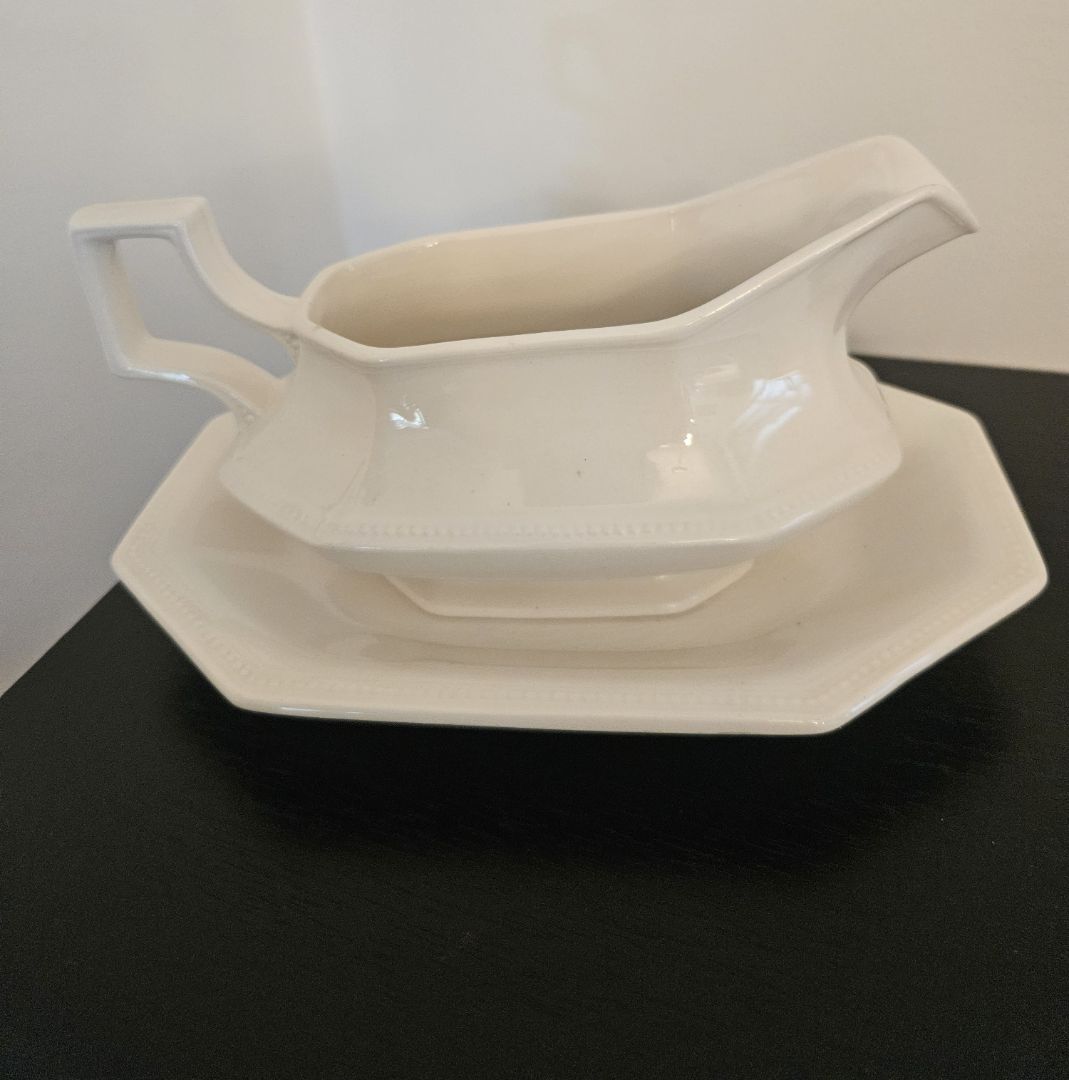 • Johnson Brothers Heritage White gravy boat with underplate. Antique. Made in England. Two-piece set.
