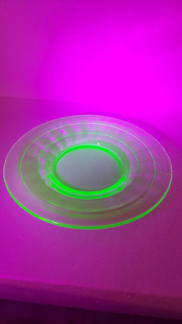 • Made from 1929 - 1933. Green depression uranium Vaseline glass. Has wear, well used knife marks.