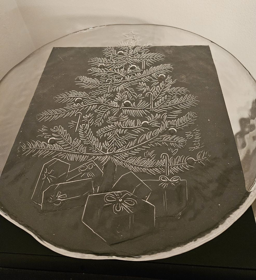 • Glass cookie plate or platter adorned with a Christmas tree and presents.