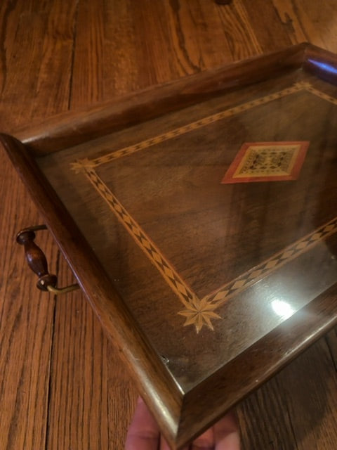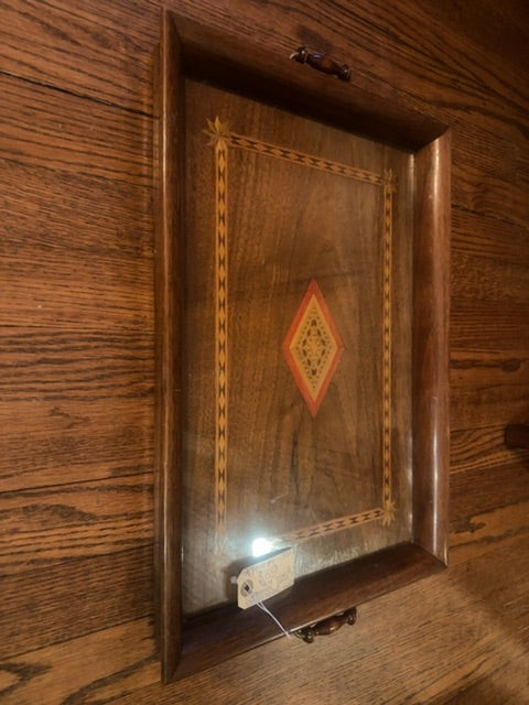 Antique, wood grain serving tray , marquetry design, wooden handles, and glass top. Probably 1930