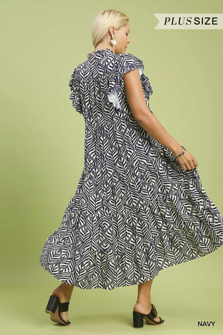 Navy Cotton Scallop Trim Ruffle Sleeve Top - Extra Large