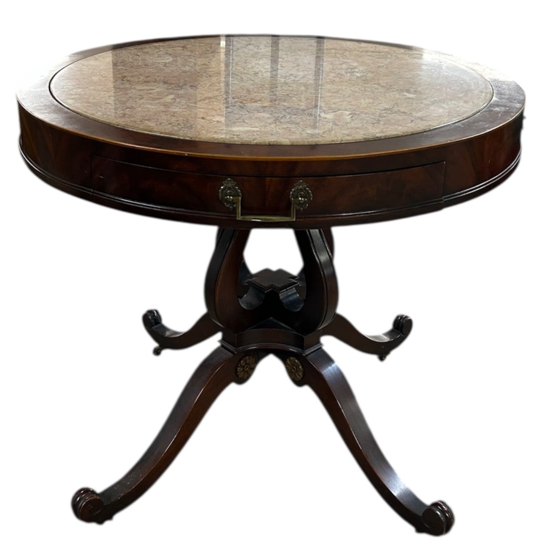 1 Drawer Mahogany Drum Table with Pink Marble Inset 32Wx32Dx28H