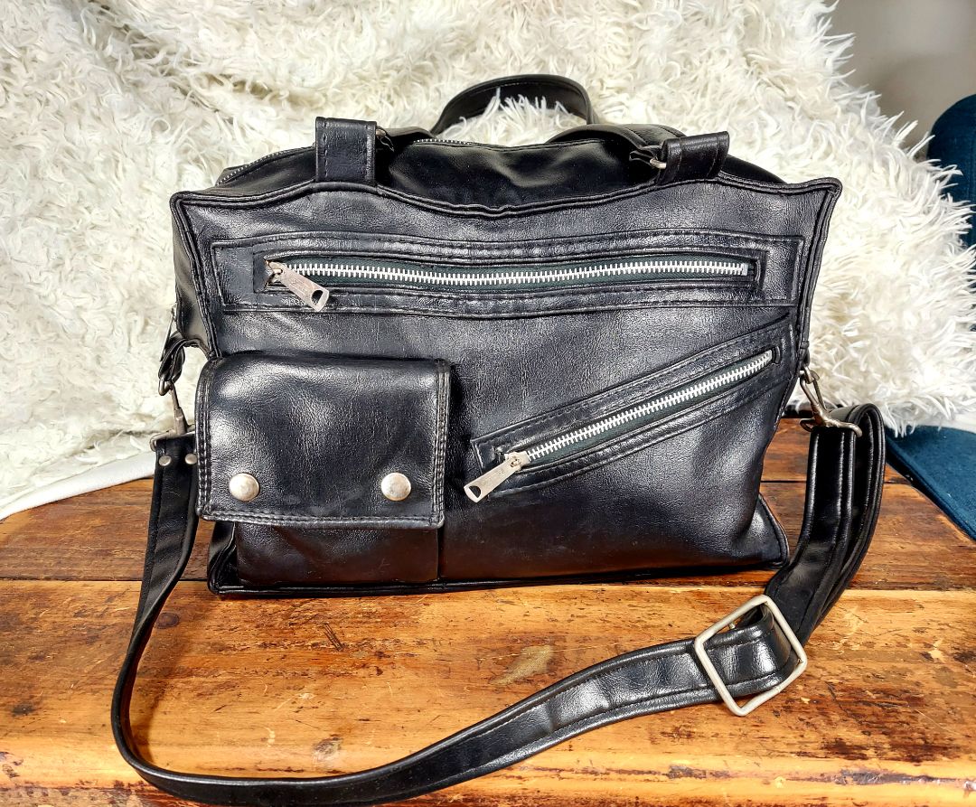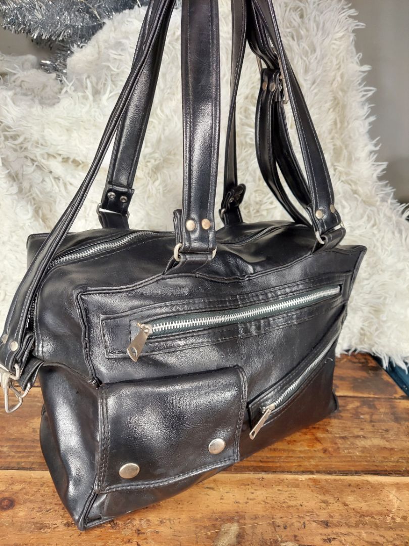 Has multiple zippered compartments. Perfect weekend bag. Purse. Camera bag. Tote. All the things. The design, featuring an abundance of external metal zippers and pockets, gives it a punk or motorcycle "biker" aesthetic.