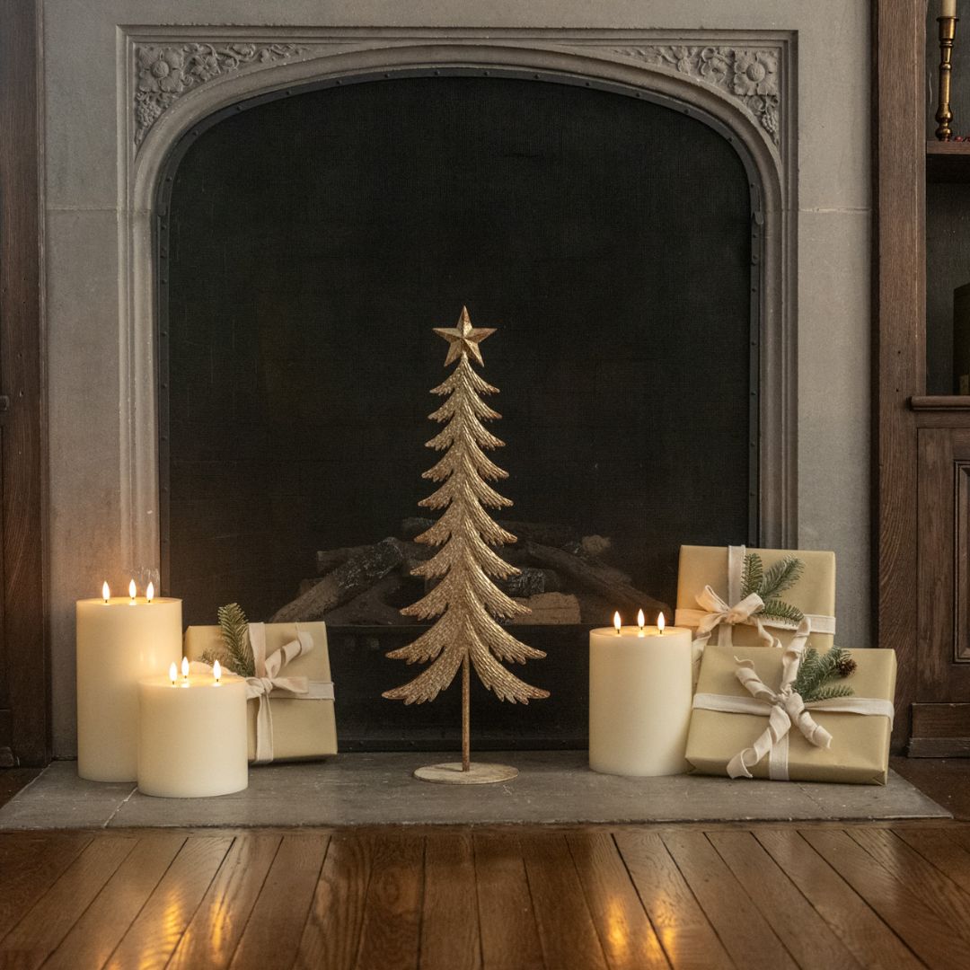 Crafted from shimmering gold metal, this sculptural tree features a sleek, open design topped with a classic star for a refined and festive look. Its height and slim profile make it perfect for entry tables, mantels, or as part of a larger holiday centerpiece.