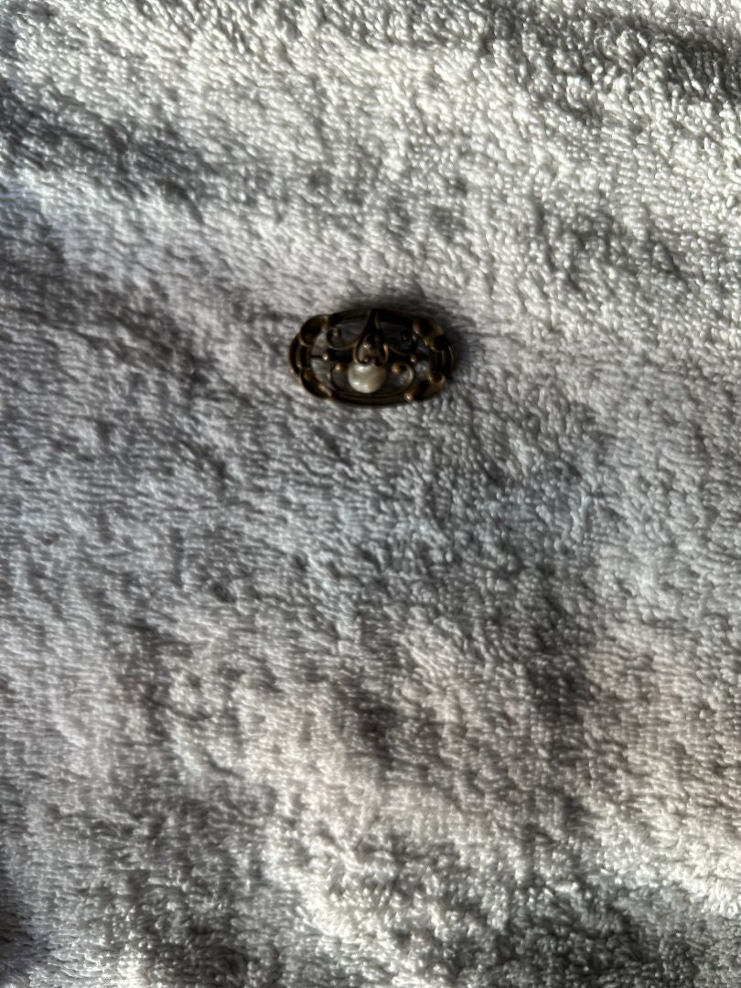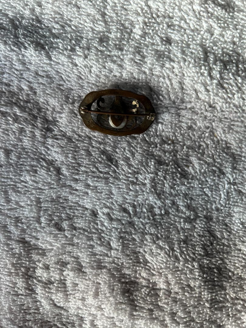 Antique Art Nouveau Brass Brooch. Open Work Design. Central White Cabochon Stone & Small Red Accent Stone Ca. 1890-1915