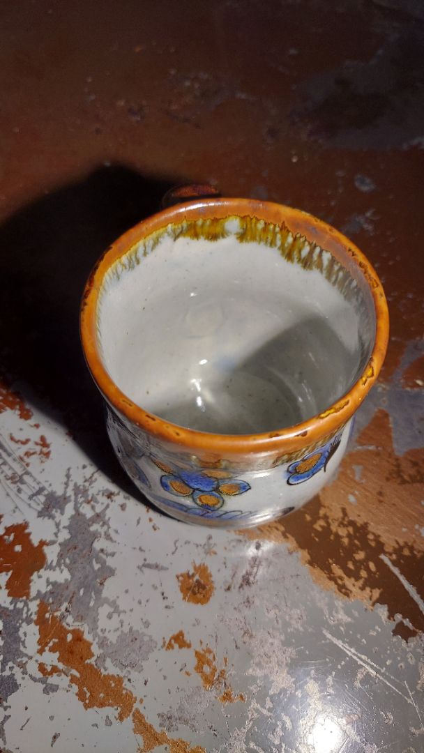 • It features a distinctive blue bird design, which is a common artist signature or motif for the pottery workshop.