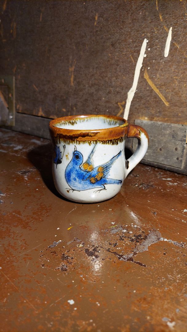 It features a distinctive blue bird design, which is a common artist signature or motif for the pottery workshop.