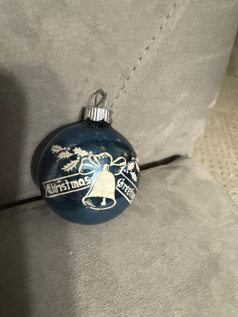 Vintage blue Shiny Brite with white stenciled Christmas Greeting.