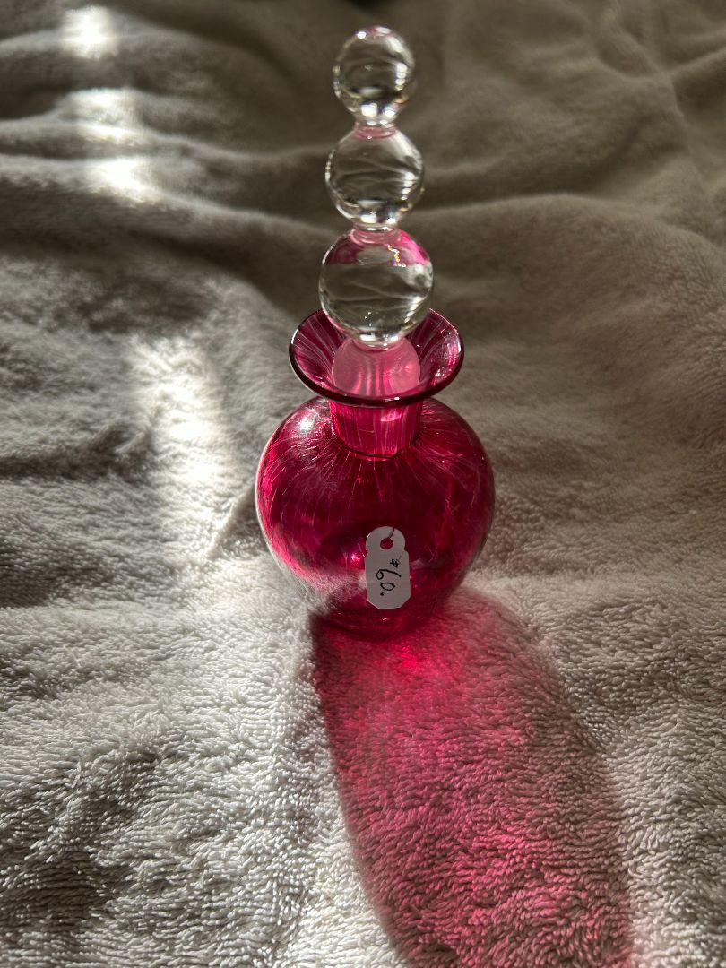 Chrystal ball stopper. 5.5" tall. Cranberry glass perfume bottle.