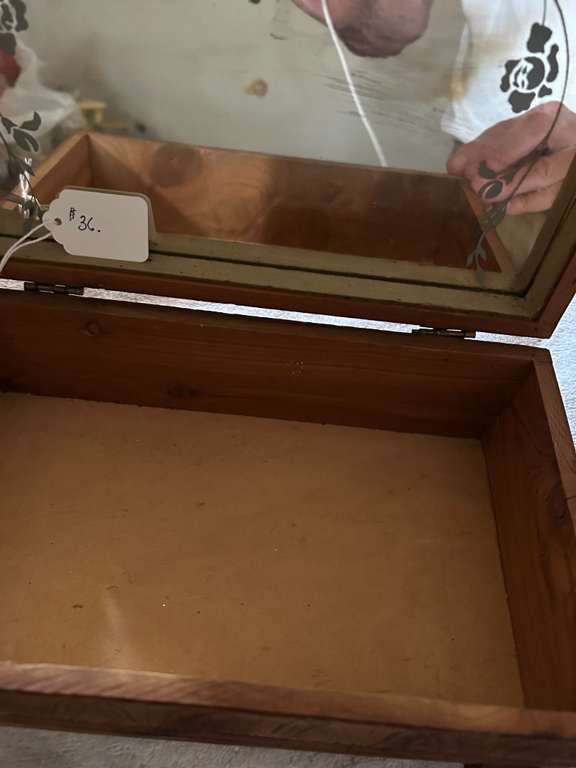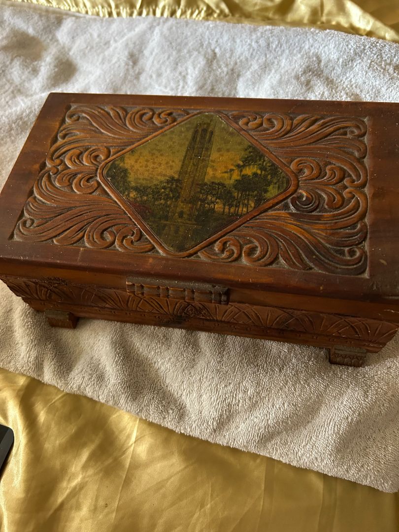Vintage carved Cedar Wood Jewelry/mini Hope box with etched Mirror. 6"X10.5"X3.5" deep.