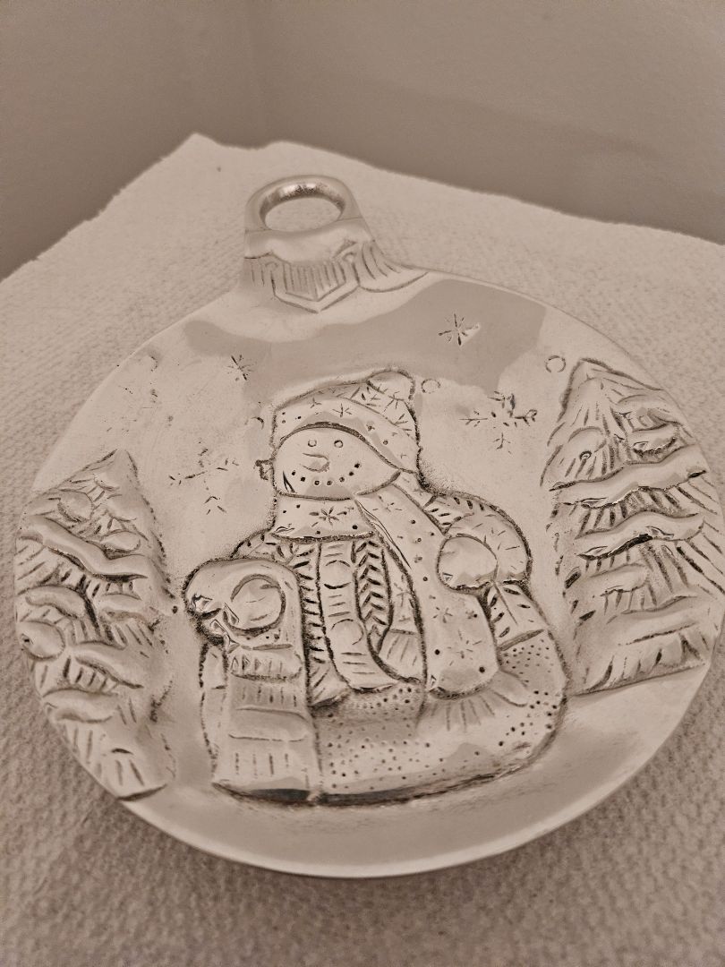 Holland Boone polished pewter snowman dish shaped like an ornament.