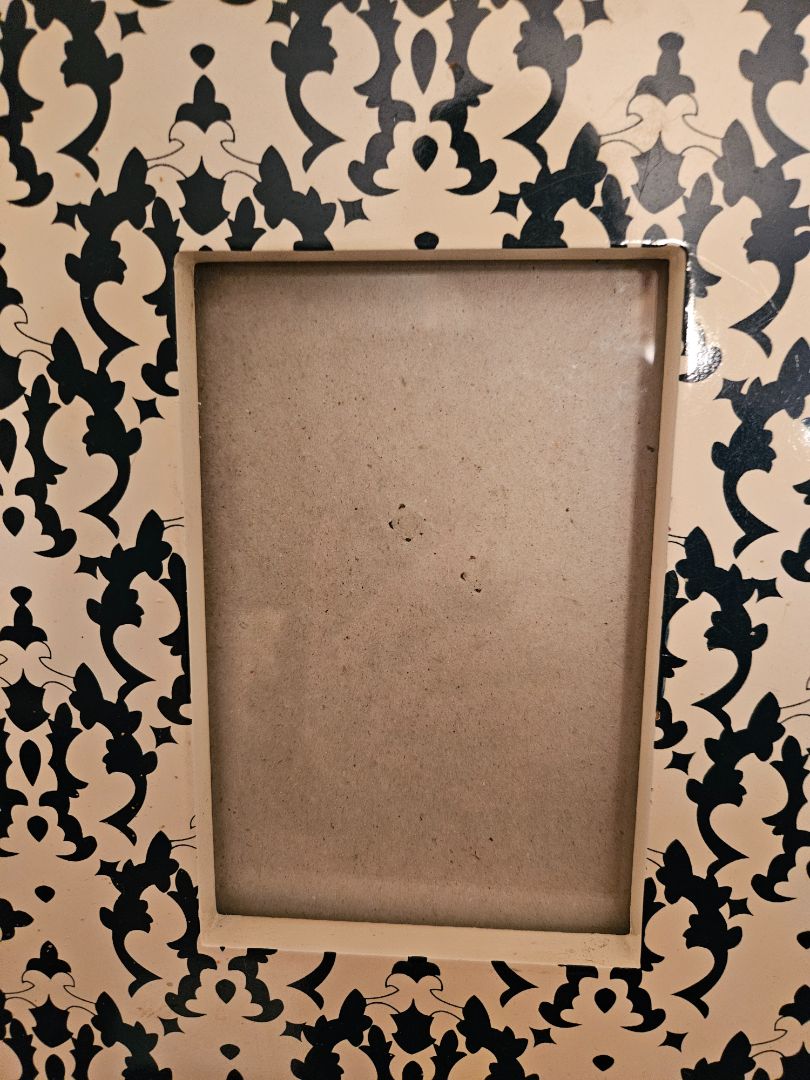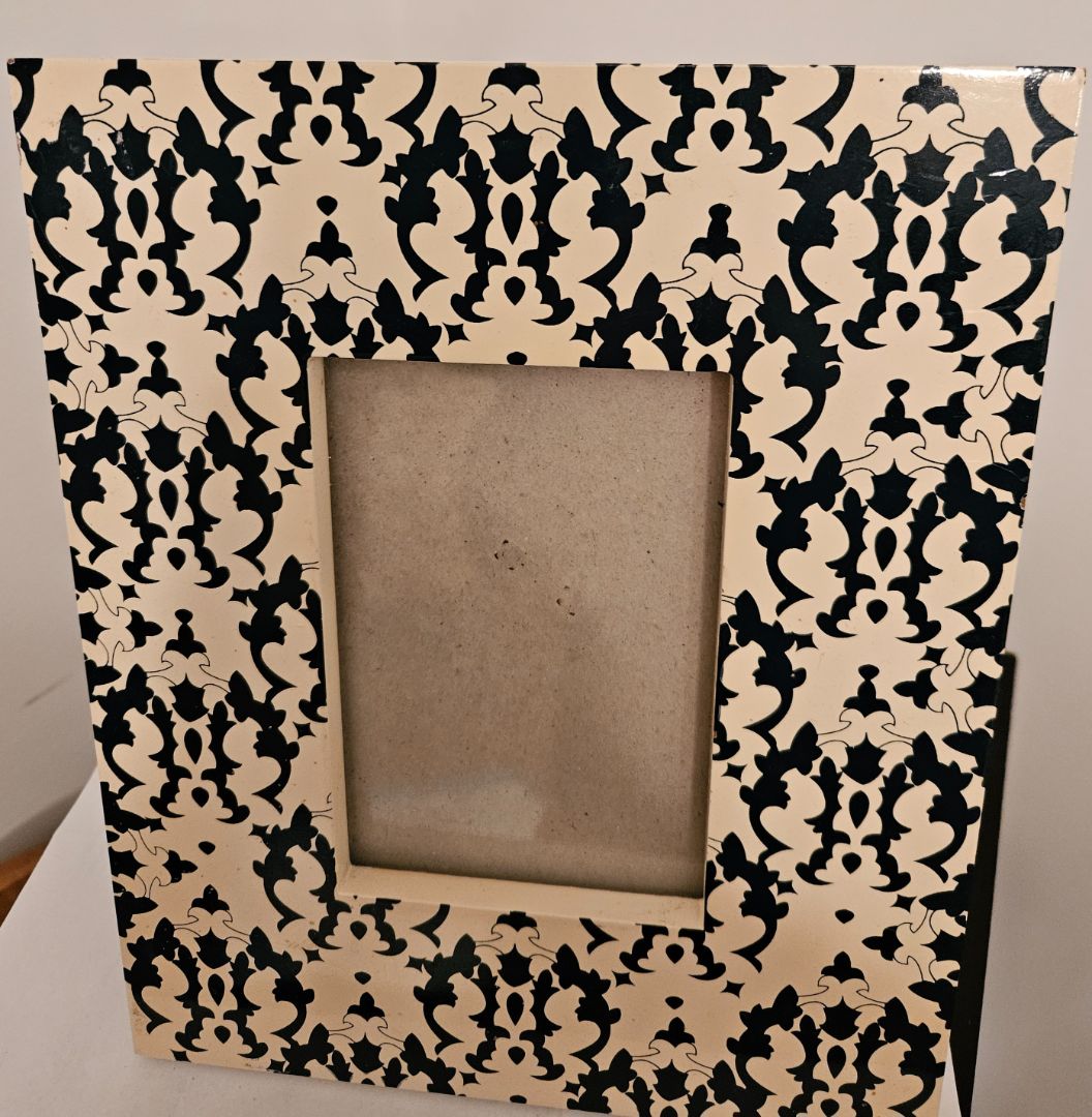 Interesting picture frame with indigo blue print against cream background.