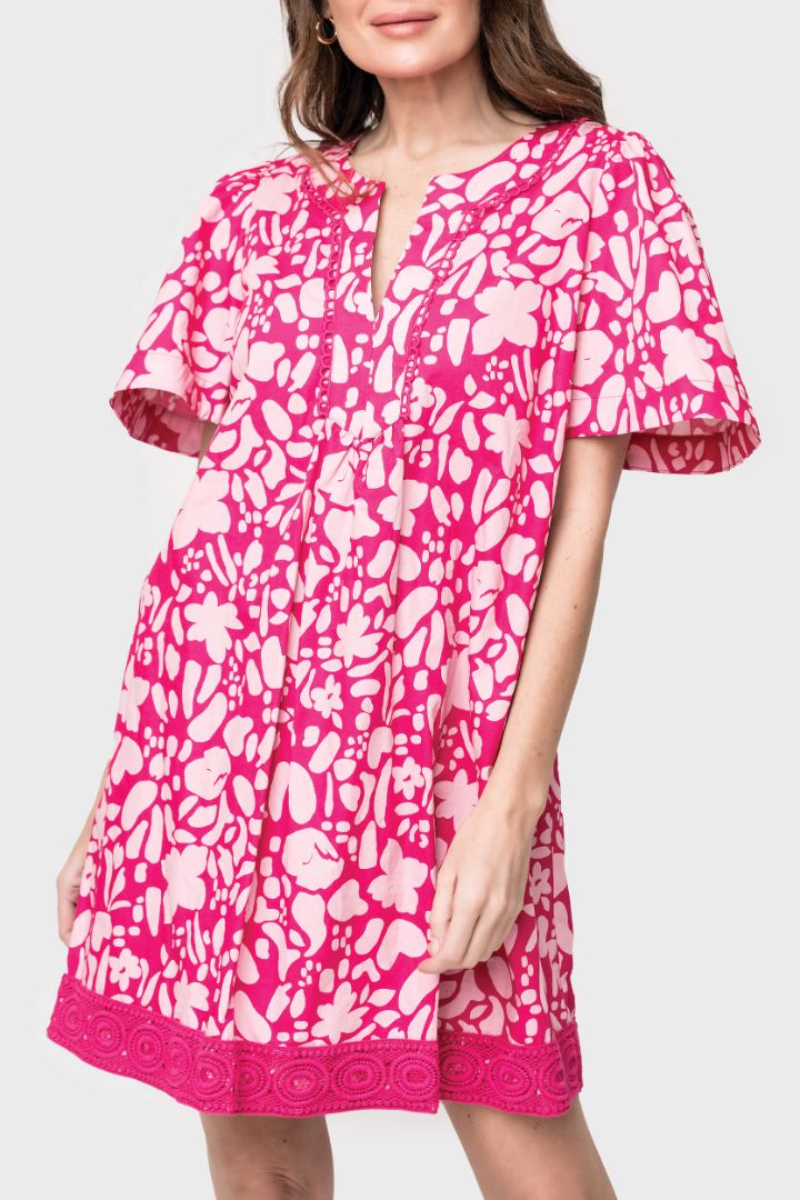 Featuring a flattering split neckline with decorative trim and soft flutter sleeves, this cabana-style dress drapes beautifully while allowing easy movement. The bold pink potager print makes a statement on its own, while the crochet trim along the hem adds a subtle touch of texture and charm. Lightweight and comfortable, it’s ideal for brunch dates, errands, vacation days, or casual gatherings where comfort and style matter equally.