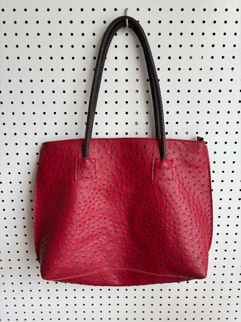 Red Ostrich Faux Leather Zippered Purse/Tote with Brown Braided Rolled Handles ((New)