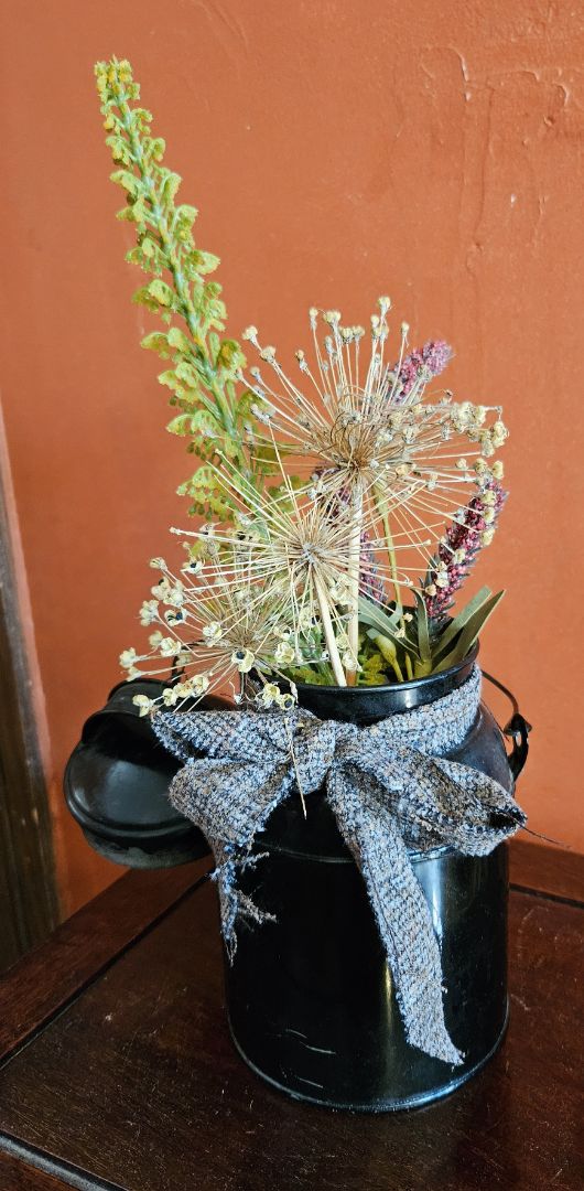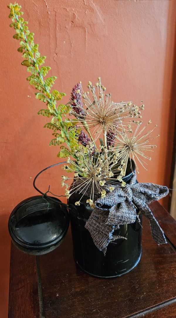 Small black milk can with fall flowers and lid