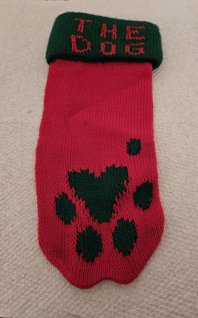 Knitted stocking for the dog. Ornament or hang on the fireplace.