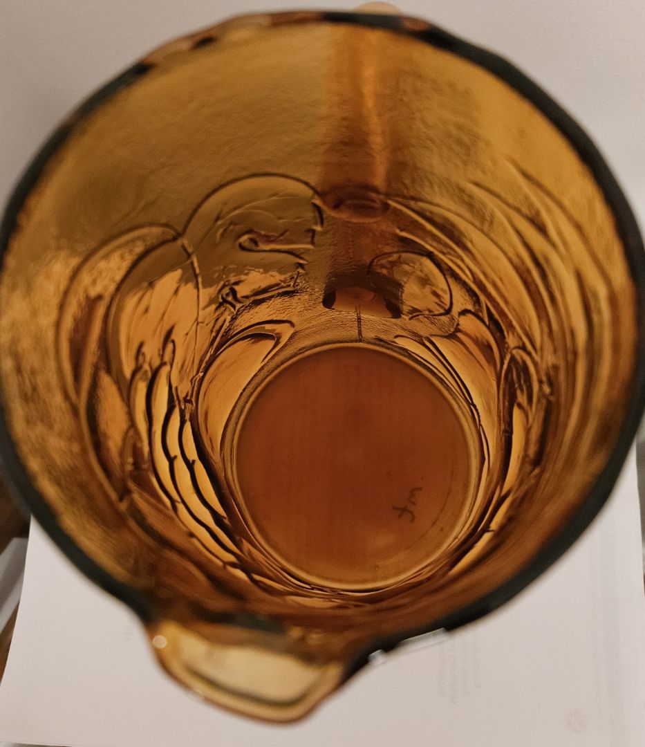 Vintage Italian glass pitcher. Amber color with embossed fruit and vine.