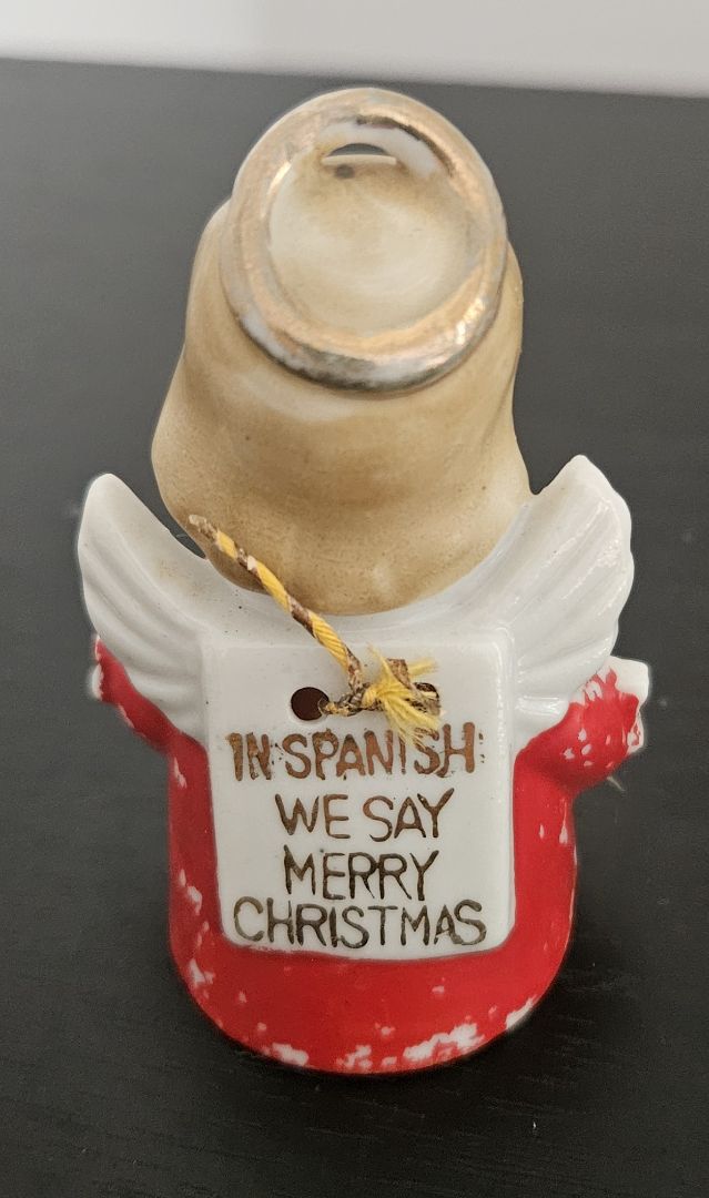 Vintage Ardalt "Merry Christmas" in Spanish angel bell. It is worn but still lovely.