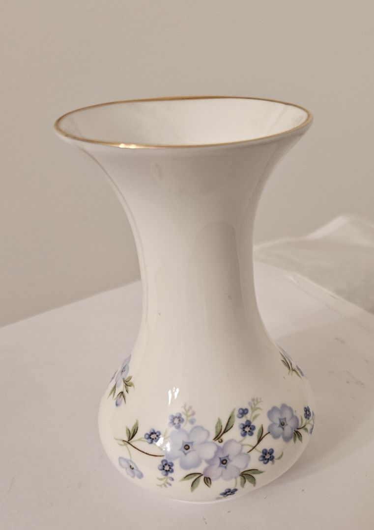Vintage Aristocrat Bone China bud vase with blue flowers and a gold rim.