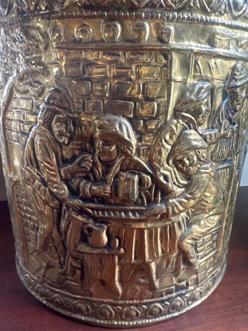 Vintage, English Fireplace bucket in Embossed brass. English pub scene. Sold as is,