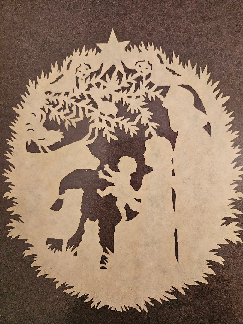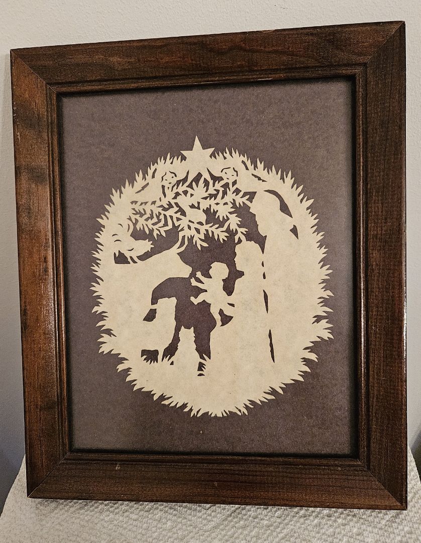 Framed folk art from Germany. Scissor cut Nativity scene.