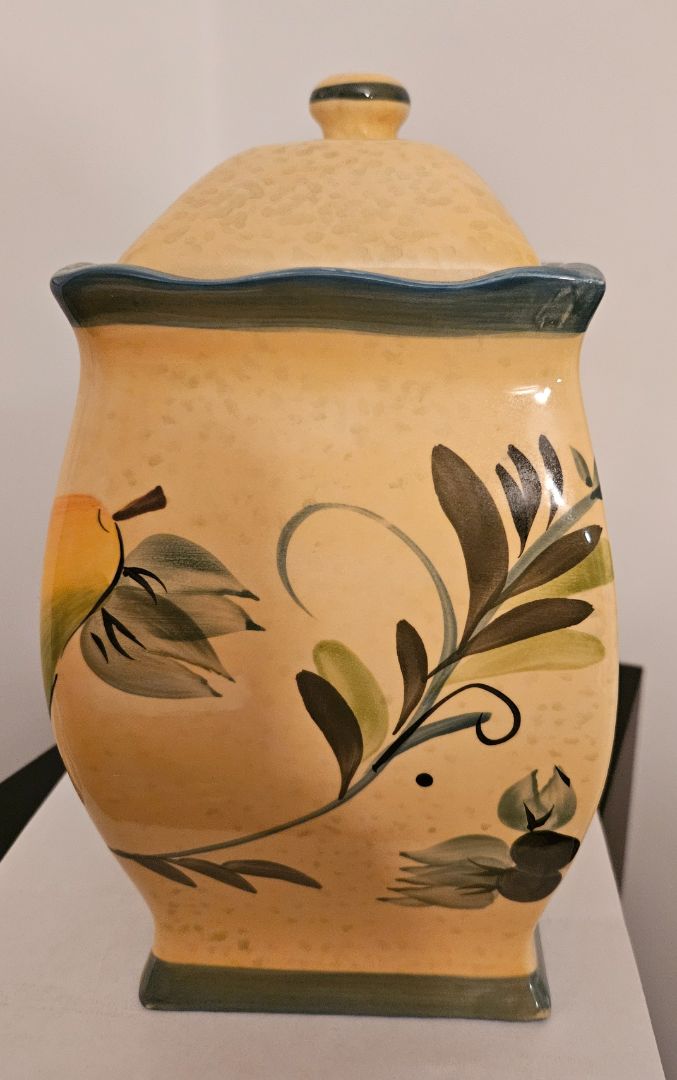 Vintage Nonni's biscotti jar and lid. Handpainted in Tuscan style with fruit and leaves.