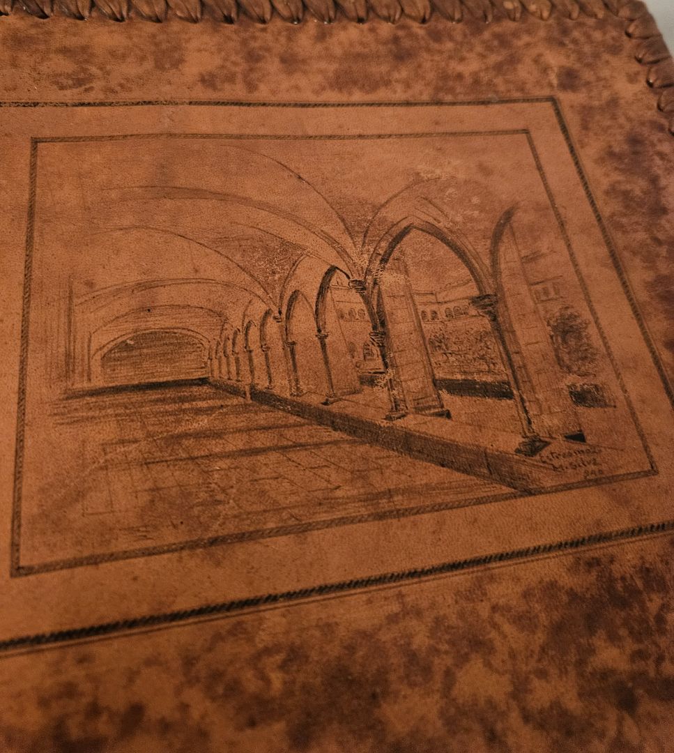 Interesting photo album with a leather cover and black pages. Shows an arched scene.