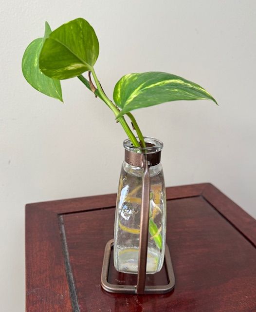 Vintage Look Round Metal/Glass Propagation Vase with Golden Pothos