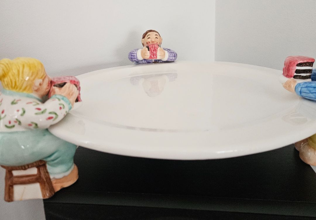 Fun vintage Lotus Chubbies "Let's Eat Cake" ceramic footed plate. Three people enjoying their cake hold up the plate.