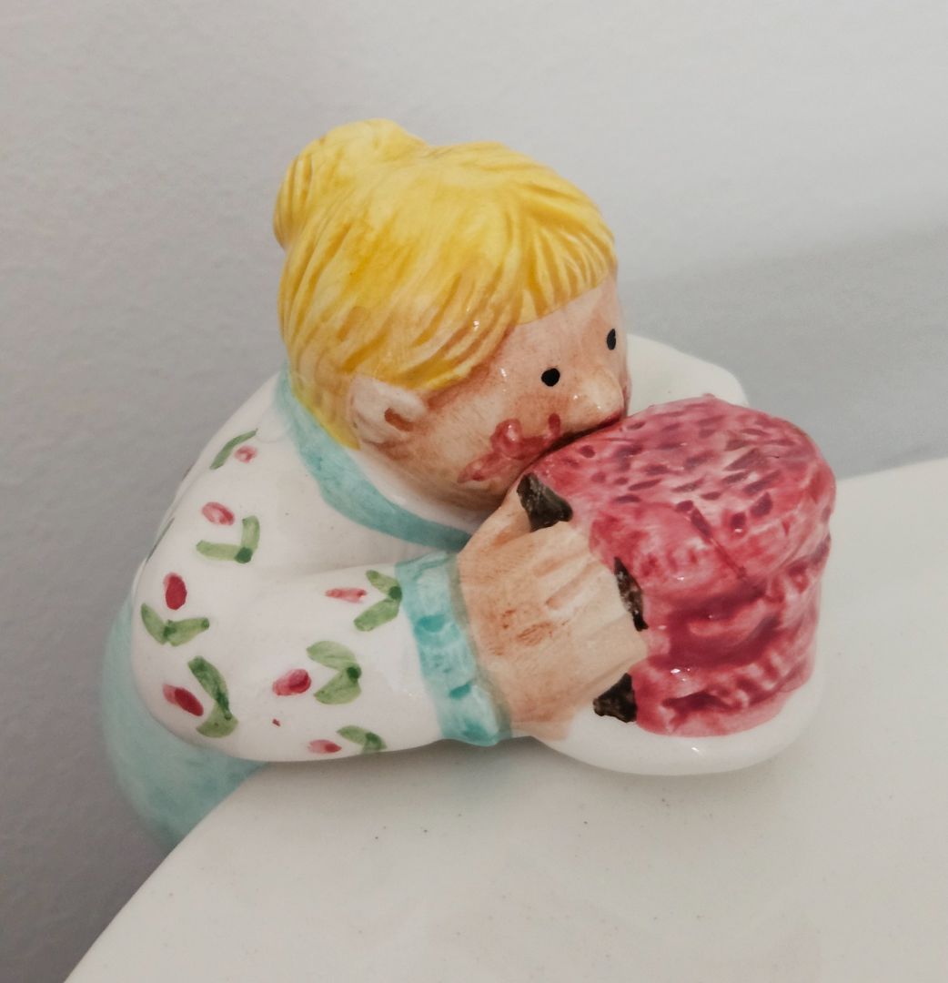 • Fun vintage Lotus Chubbies "Let's Eat Cake" ceramic footed plate. Three people enjoying their cake hold up the plate.
