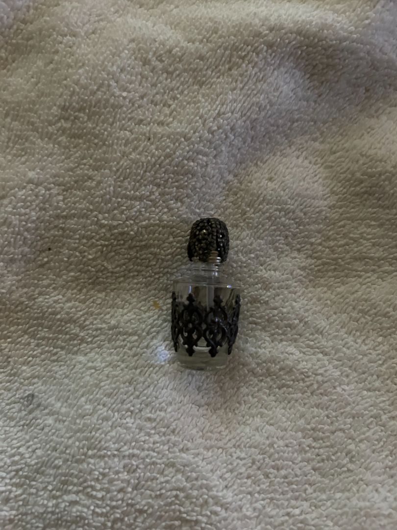 Miniature Black Perfume Bottle. Vintage. W/Decorative Metal Overlay