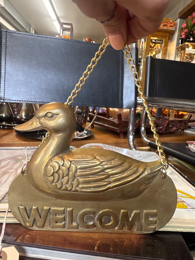 • Vintage,solid,brass,,Welcome Duck ,, sign with chain