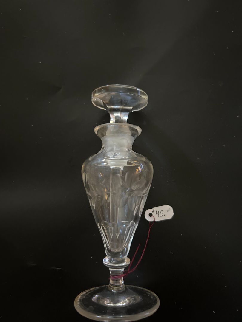 Vintage Urn shaped Vanity perfume bottle with etchings. Crystal stopper. 5.25"