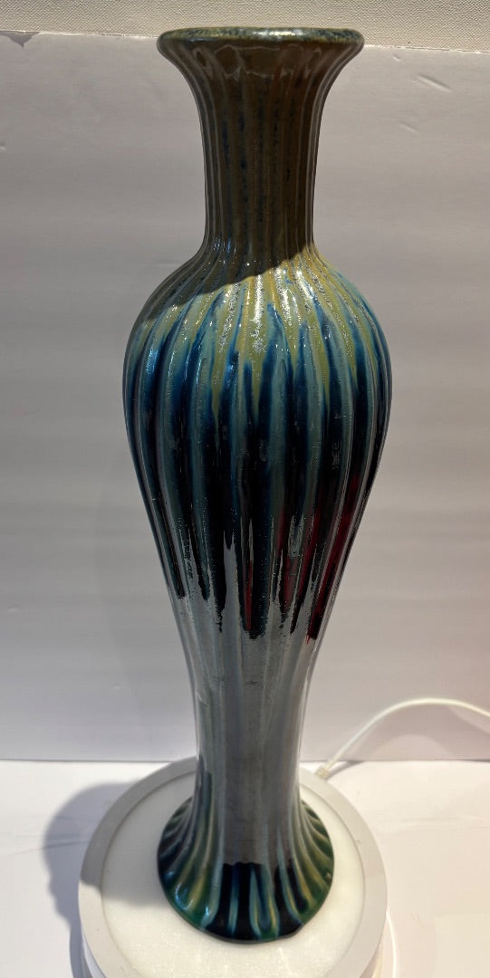 Vtg Studio Art Pottery Drip Glaze 17.5" Tall Thin Fluted Vase Green Blue Brown #402