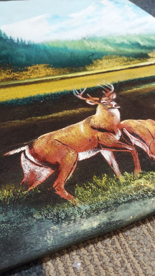 1960s Deer Grazing Autumn Mountain landscape Scene Hand painted - Oil On Velvet mounted on canvas - Chuy Moran workshop, Bob Ross style (AS-IS)