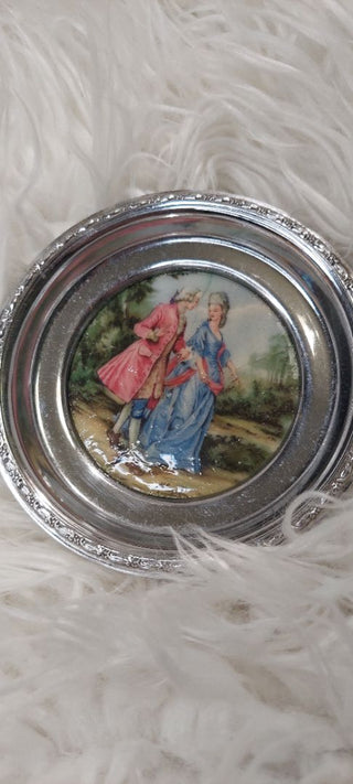 (B) Silver framed ceramic French Scene Art, Ashtray and coaster. AS IS.