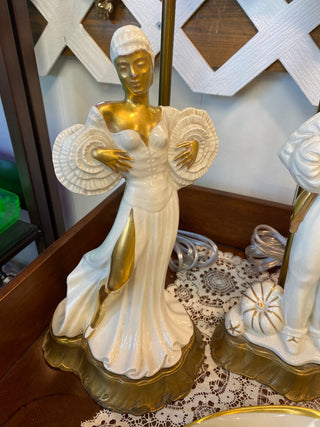Pair 1930-1940 Deco Figural Gold Trim Ceramic Lamps