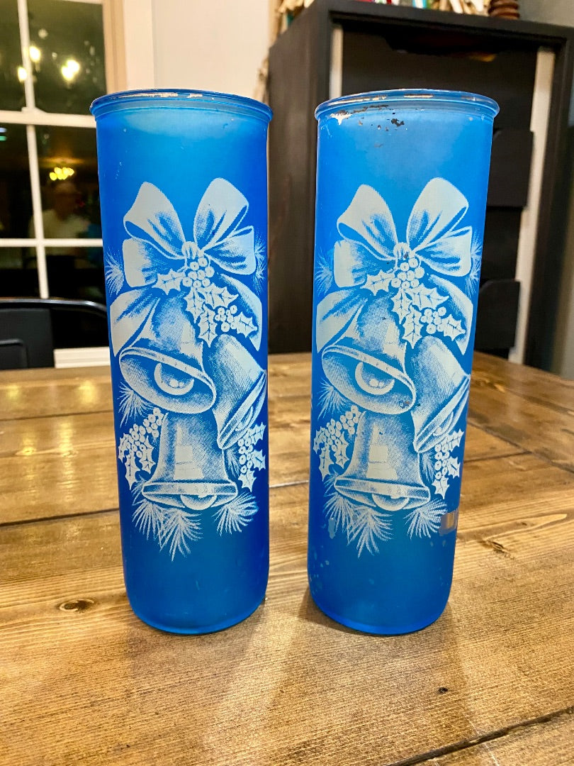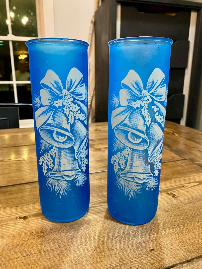 Vintage Blue Christmas Bells Pillar Candle Holder