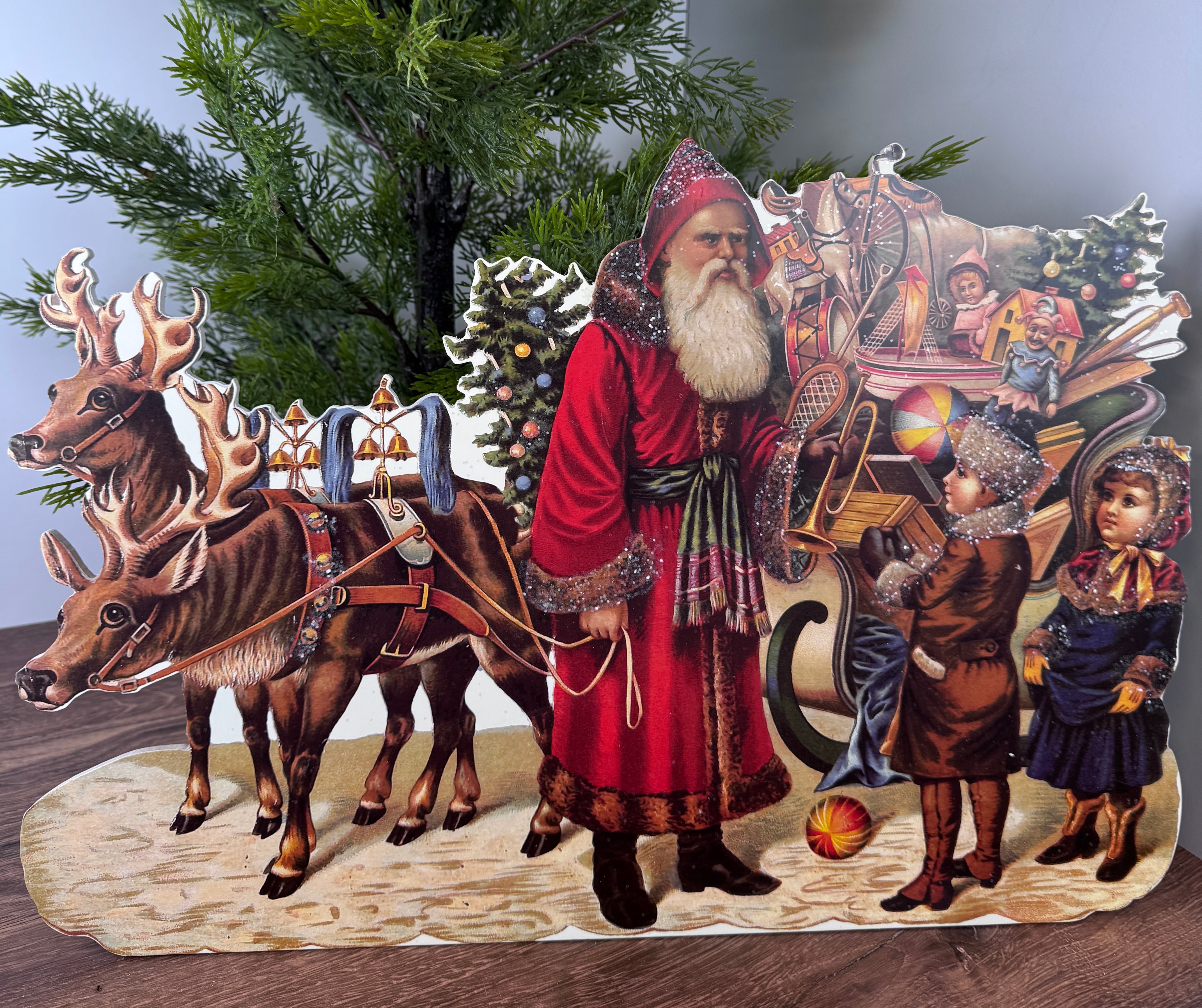 Crafted from sturdy paperboard, this freestanding display features a beautifully detailed image of Santa Claus with his sleigh brimming with toys and gifts. The lightweight design makes it perfect for mantels, entry tables, shelves, or under the tree—offering the look of an antique store window display with timeless appeal.