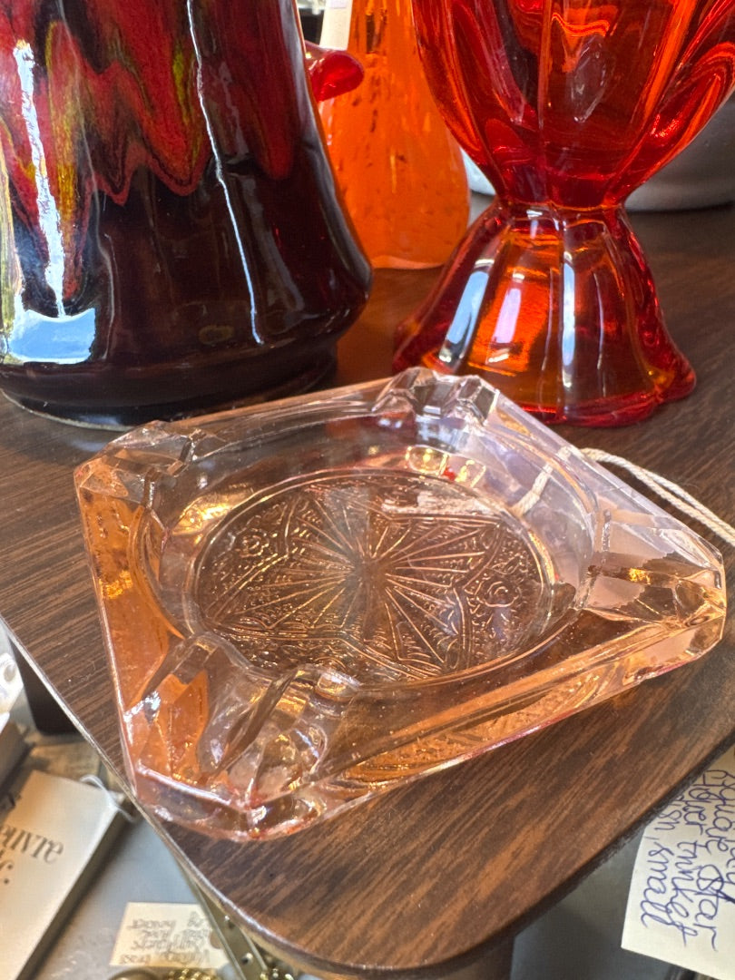 Vintag,depression glass,pink ashtray square star,flower design.
