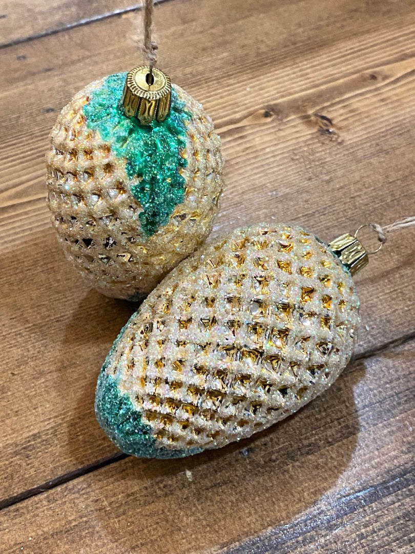 • Possibly Mercury Glass. Frosted pinecone (also kind of looks like a pineapple). Blown Glass.