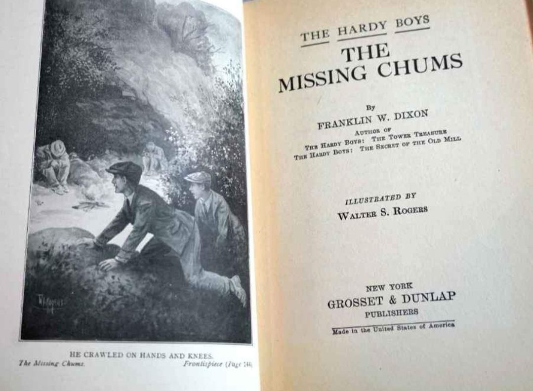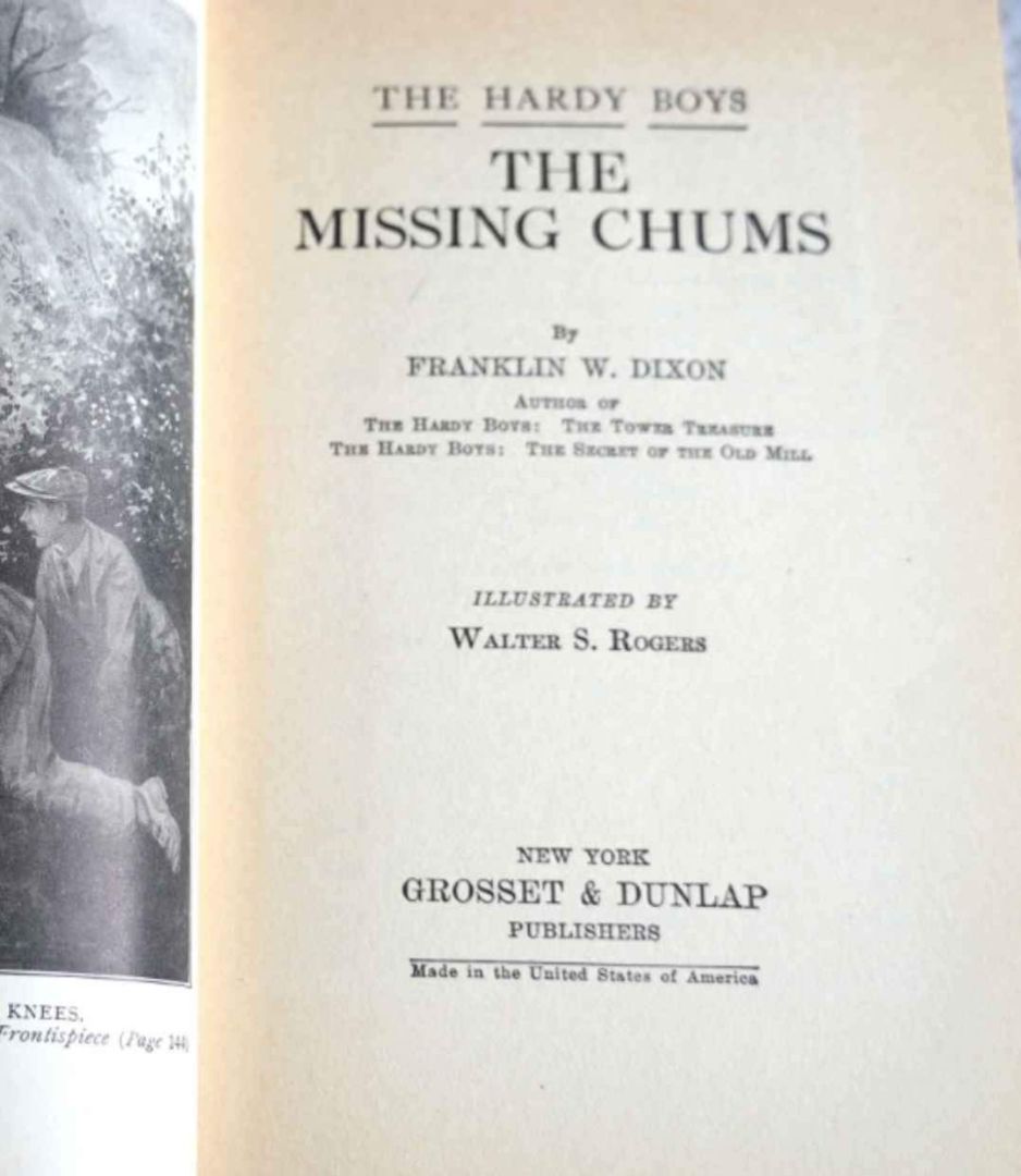 Perfect condition. The Missing Chums is volume 4 in the original The Hardy Boys Mystery Stories published by Grosset & Dunlap. The book ranks 108th on Publishers Weekly's All-Time Bestselling Children's Book List for the United States. Published in 1928, this book measures 7 1/2" by 5" with 214 pages.