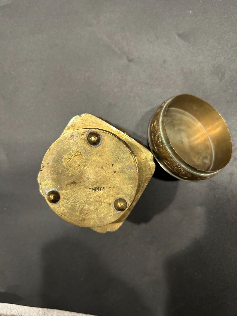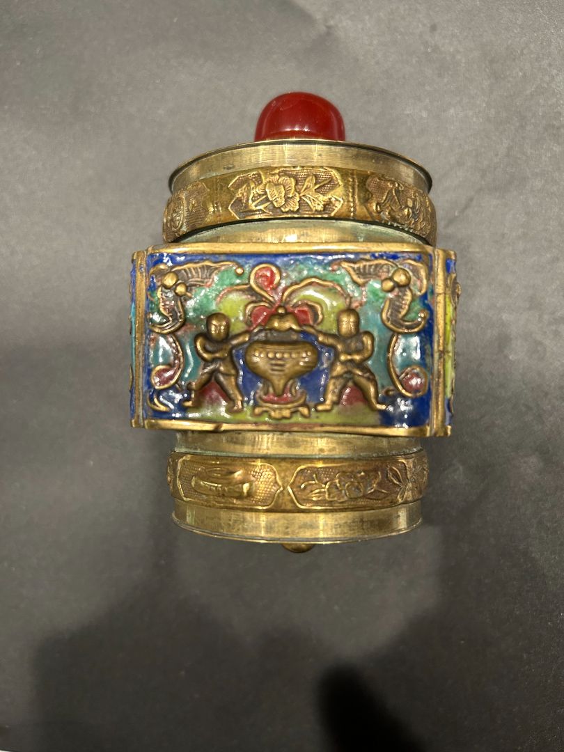 Chinese Brass Cloisonne Enamel. Scenes w/Pagoda & Hurons. Red Stone Finial Top. Ca. Late 19th to Early 20th Century.