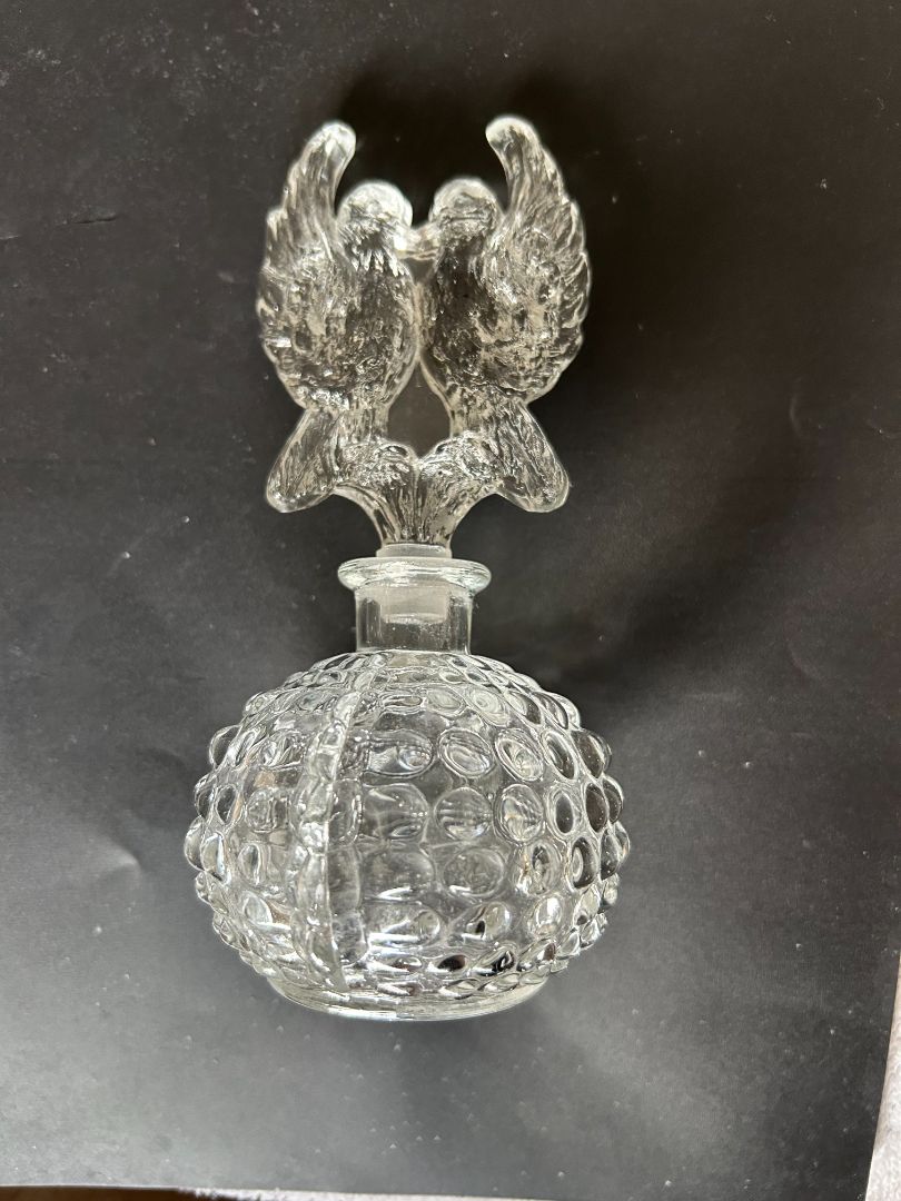 • Clear Cut Glass w/Two Turtle Doves on Stopper. Textured Hob Glass Base.