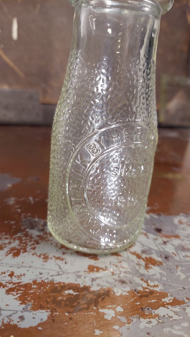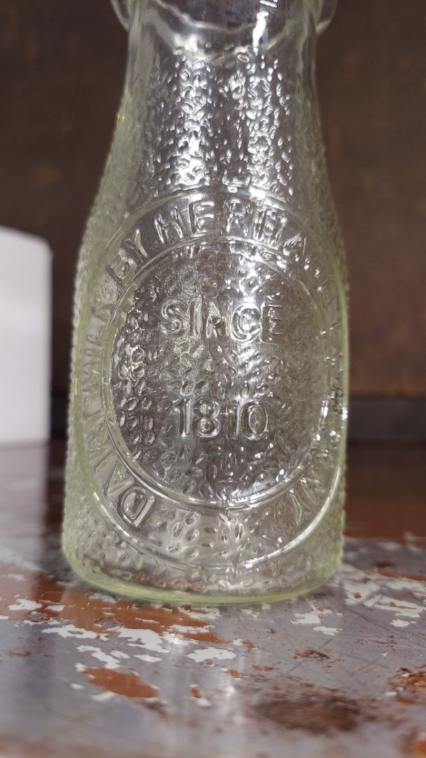 "Dairy Milk by Heritage Company - Since 1810" half pint pebble textured milk bottle