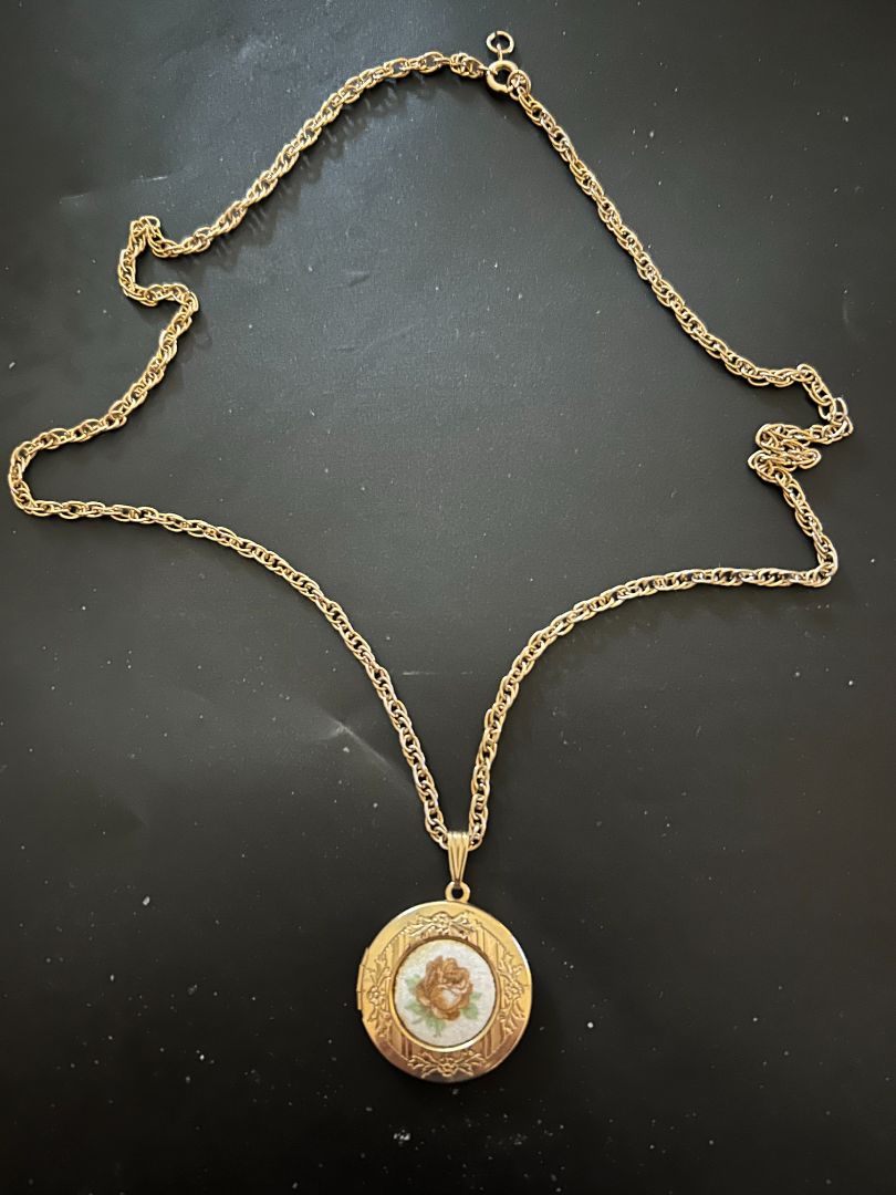Painted cameo rose Locket. 1.25" dia. 24" gold tone chain