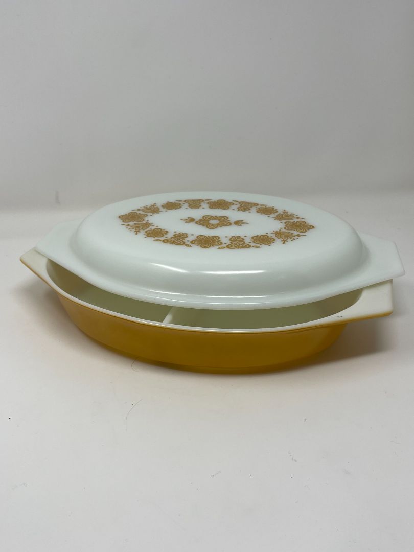 Vintage Pyrex butterfly gold oval divided casserole dish with lid.