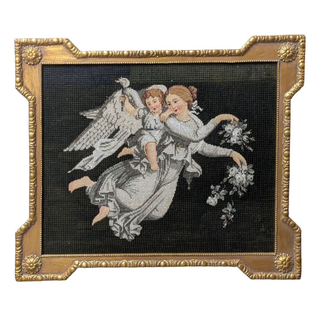 Vintage Embroidered Angel and Child Art in Gold Frame